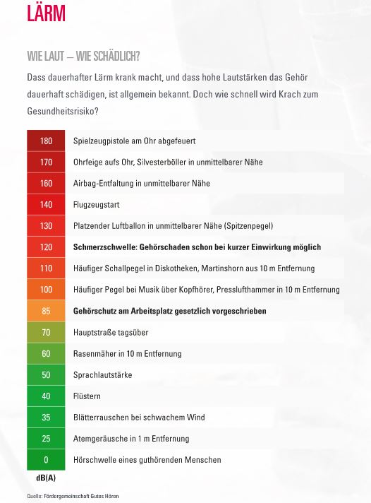 Die folgende Tabelle gibt Aufschluß darüber, wie laut unser Alltag ist und ab wann Gehörschutz sinnvoll ist…